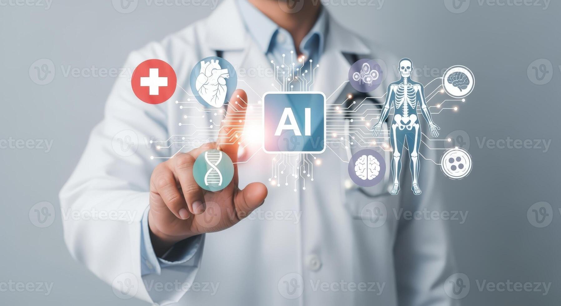 Doctor Interacting with AI Interface Displaying Medical Icons, Emphasizing Technological Advancement in Healthcare and Diagnostics Pro Photo