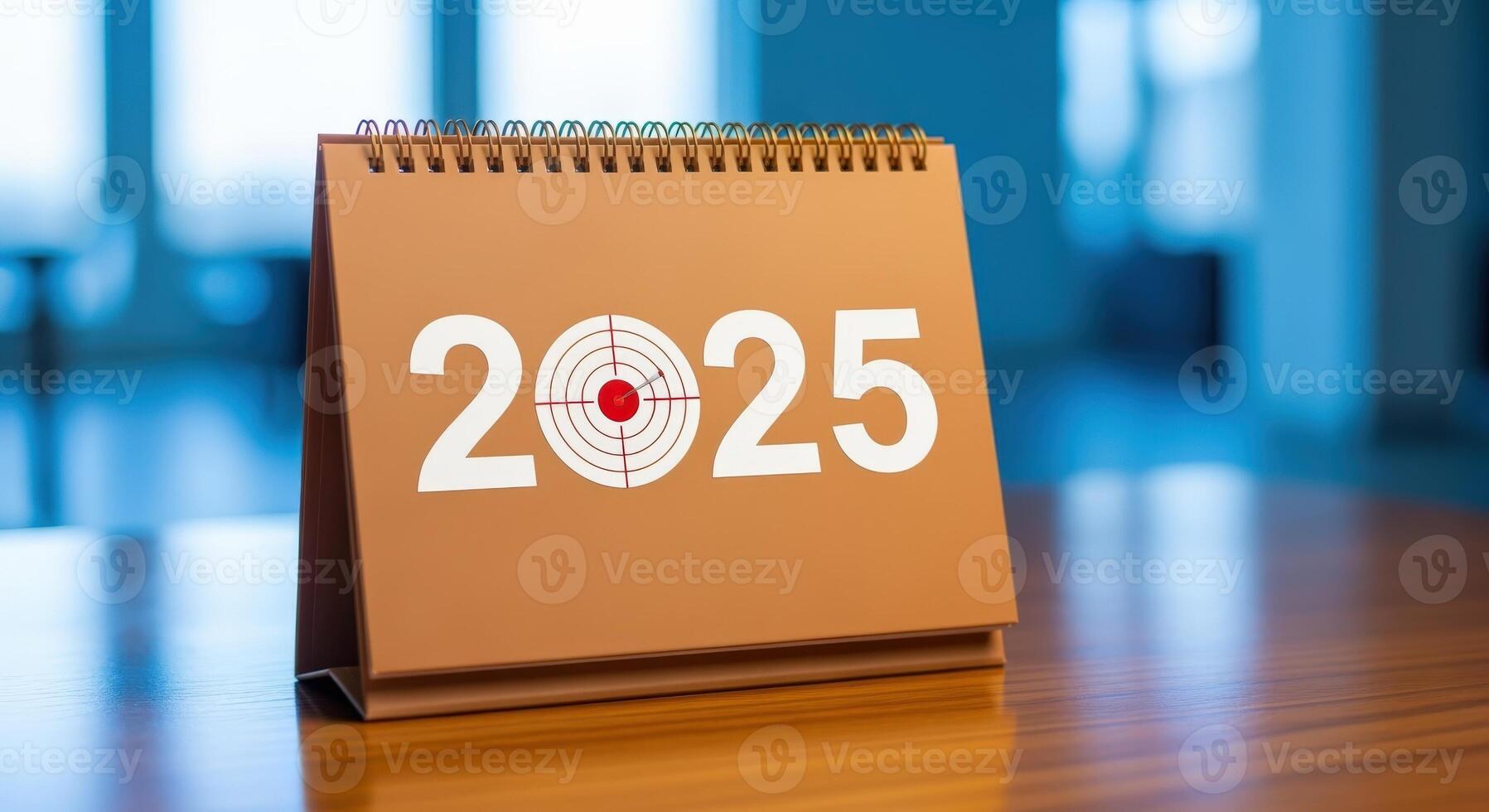 Calendar displaying 2025 with a target, representing goals, deadlines, and future planning on a desktop Pro Photo