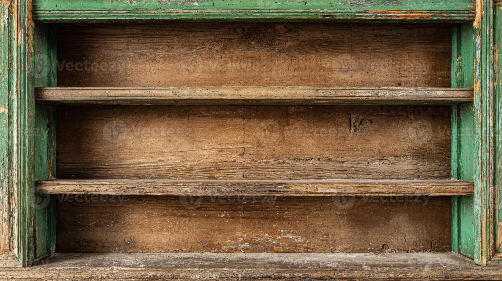 Rustic Wooden Shelves with Weathered Green Frame, Ideal for Product Placement and Mockups Pro Photo