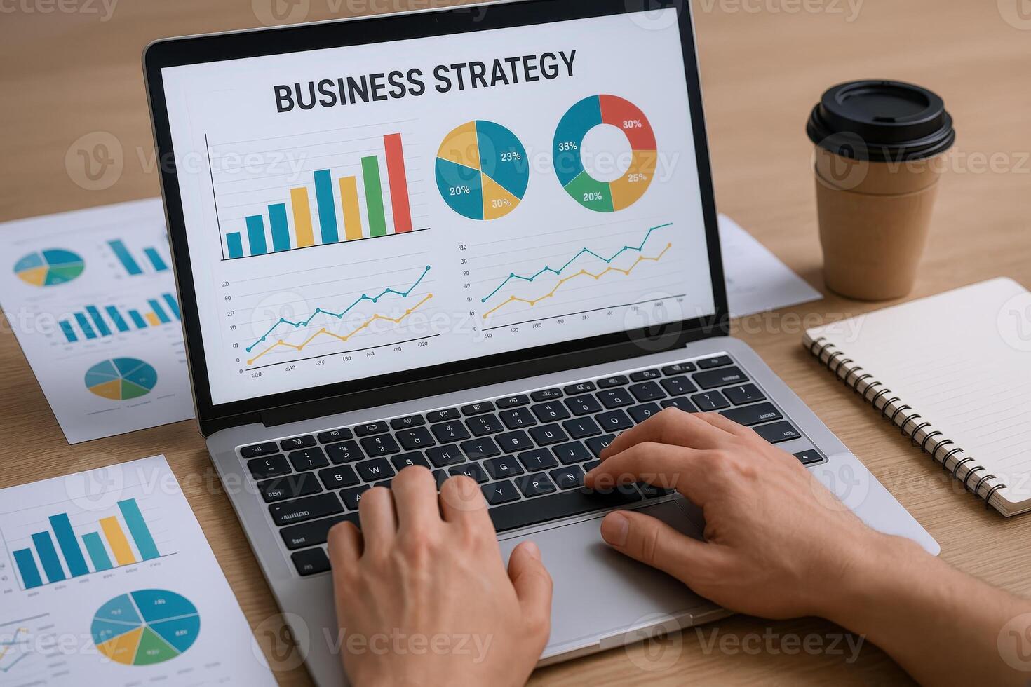 Business Strategy Analysis on Laptop Screen Displaying Charts and Graphs, Financial Data on Wooden Table Pro Photo
