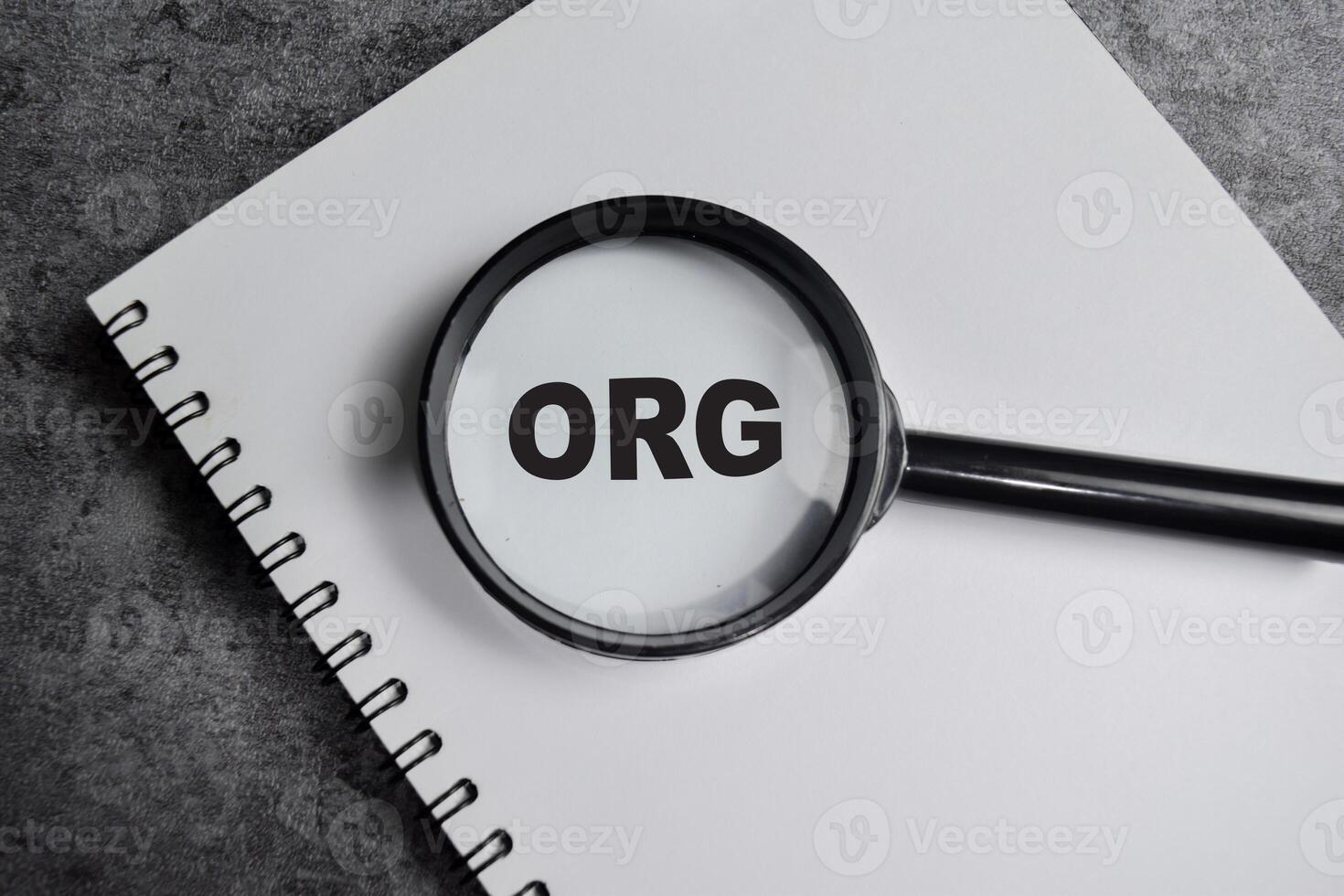 Concept of ORG with magnifier write on clipboard isolated on Wooden Table. Pro Photo