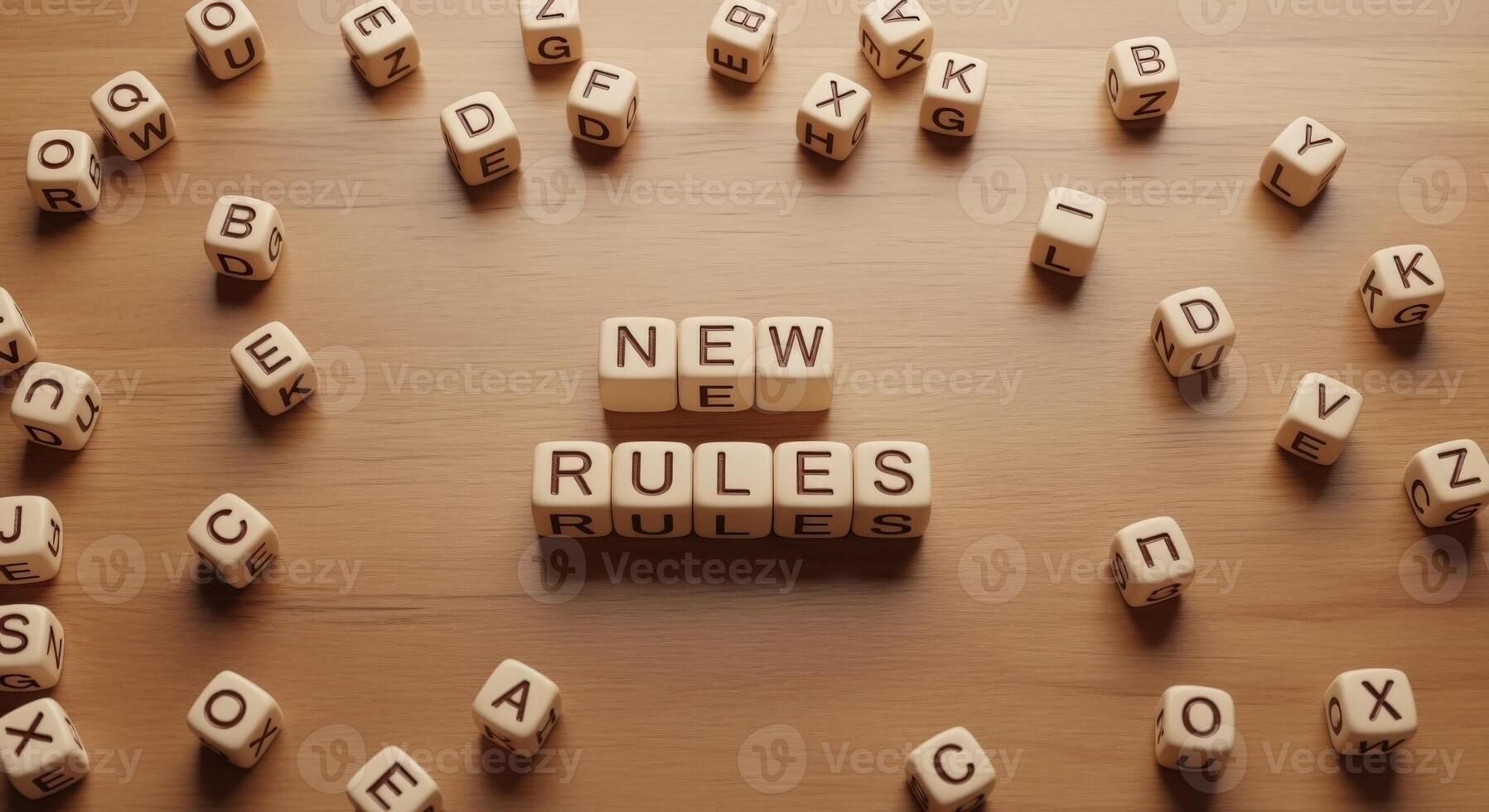 New Rules Concept Block Lettering Spelling New Rules Surrounded by Scattered Alphabet Cubes on Wood Surface Pro Photo