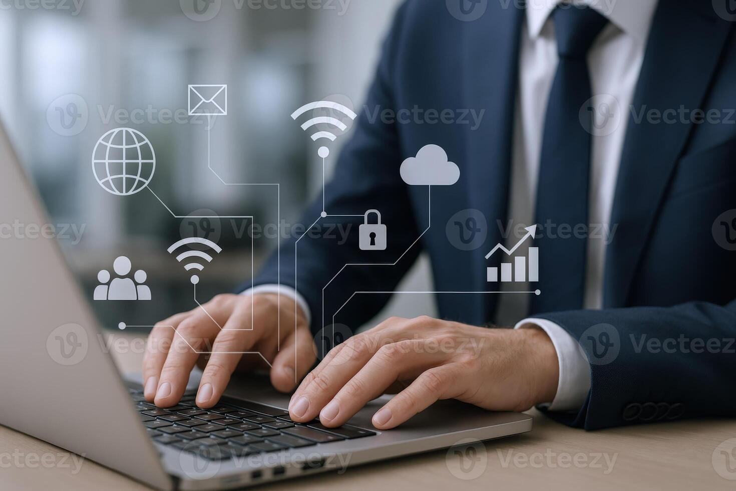 Professional Typing on Laptop with Digital Network Overlay for Business and Technology Concepts Pro Photo