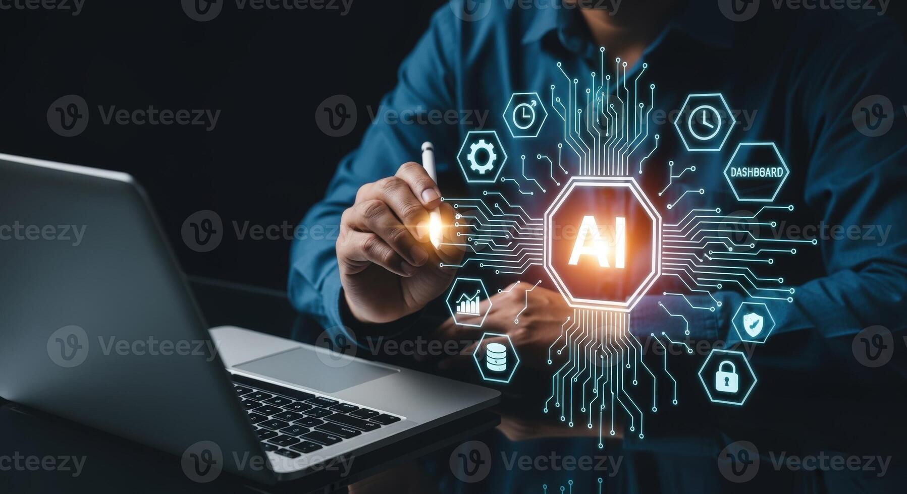 Artificial Intelligence Technology Concept Businessman Interacting with AI Interface on a Laptop for Innovative Solutions Pro Photo