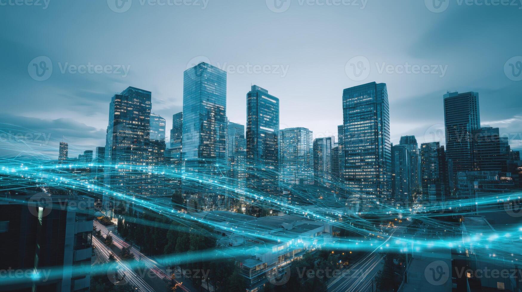 Modern Cityscape with Abstract Data Flow, Representing Technology, Connectivity, and Digital Innovation Pro Photo