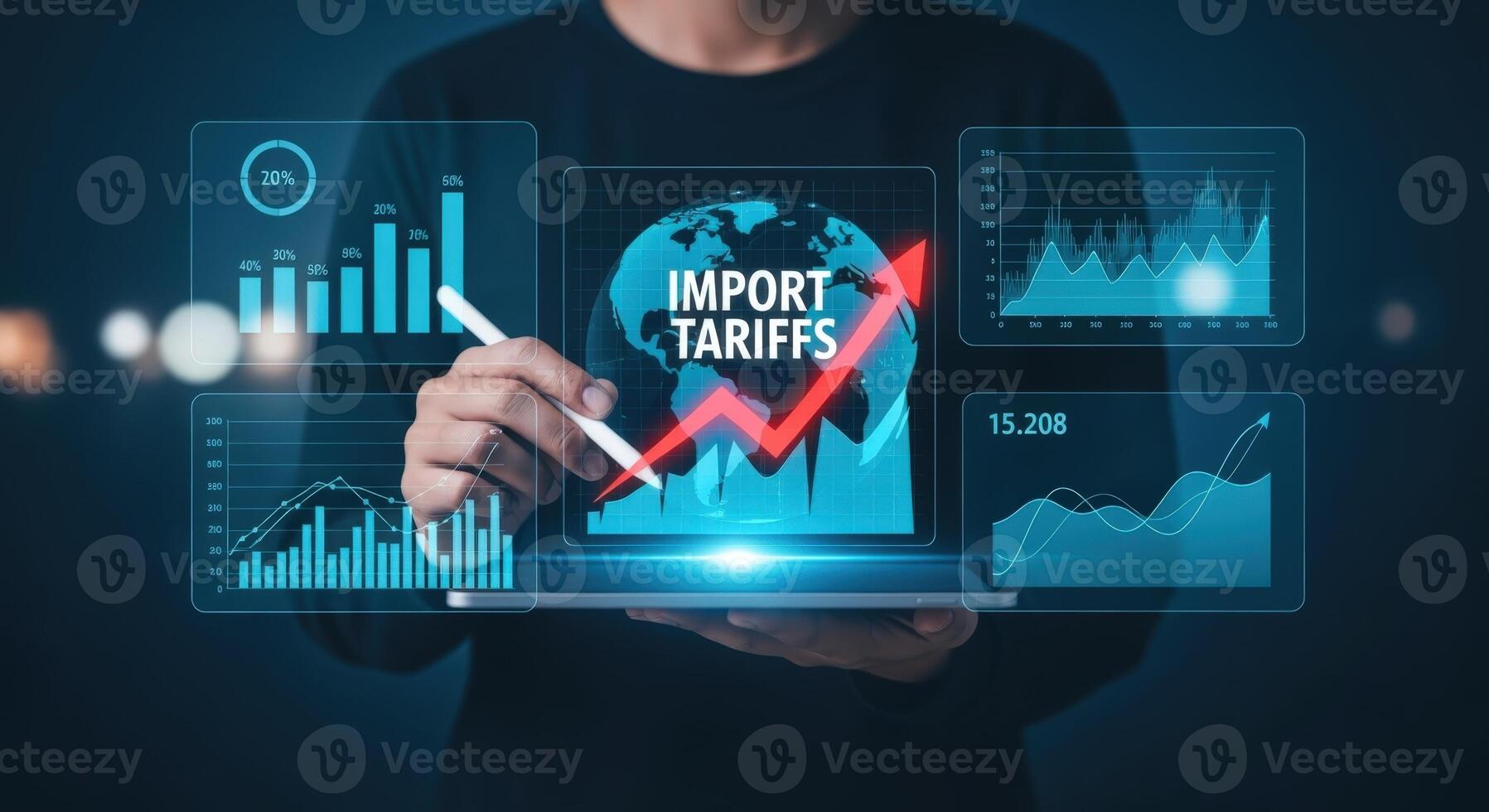 Import Tariffs Analysis Man Using Digital Tablet Analyzing Global Trade Data and Financial Growth Charts for Business Strategy Pro Photo