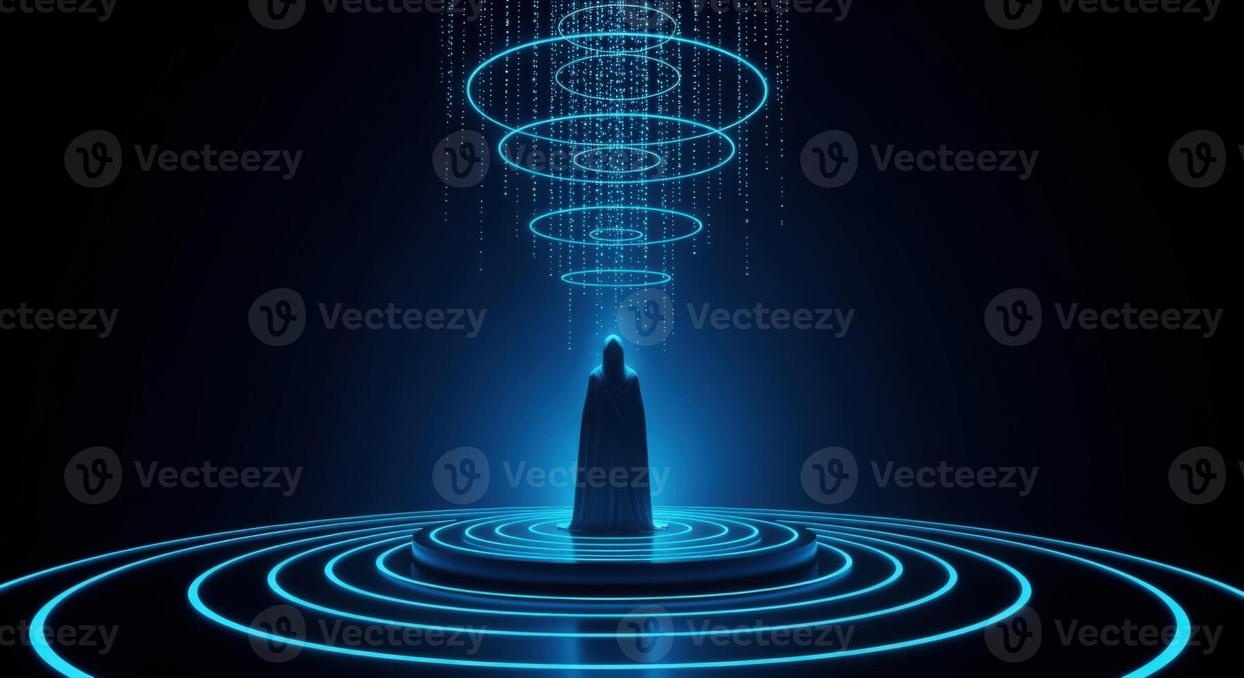 Abstract figure stands beneath concentric neon circles, surrounded by futuristic glowing technology, creating a modern, dynamic image Pro Photo