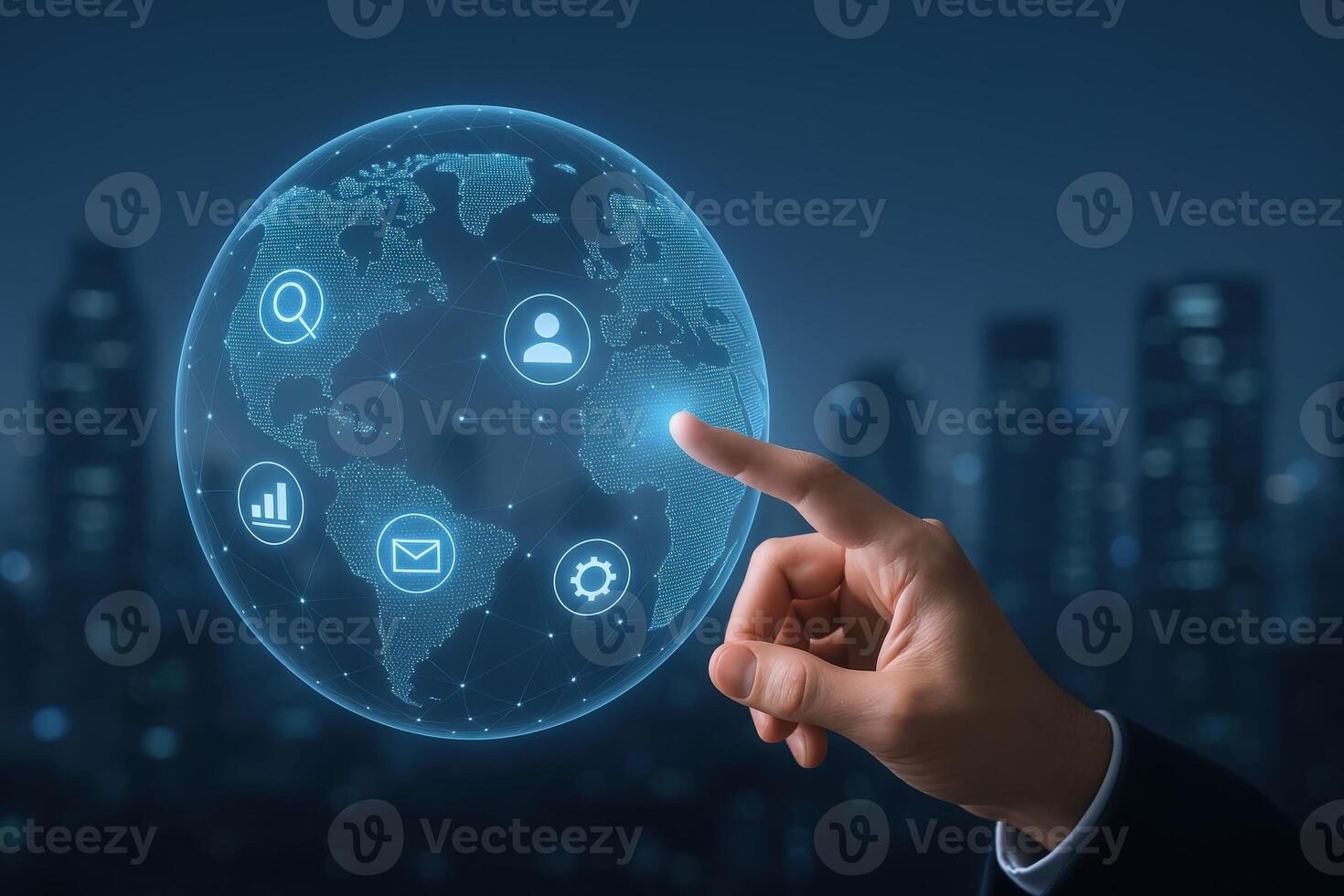 Digital Global Connection Hand Interacting with Holographic World Map Interface, Data Visualization on Cityscape Background Pro Photo