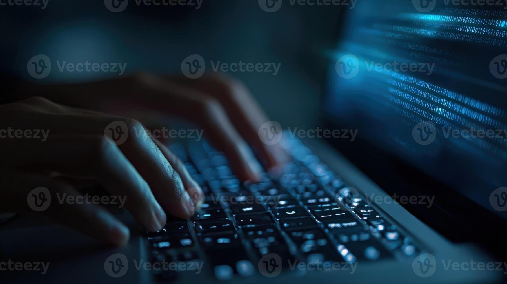 Coding on Laptop Hands Typing Binary Code on Keyboard in Dark Blue Environment Pro Photo