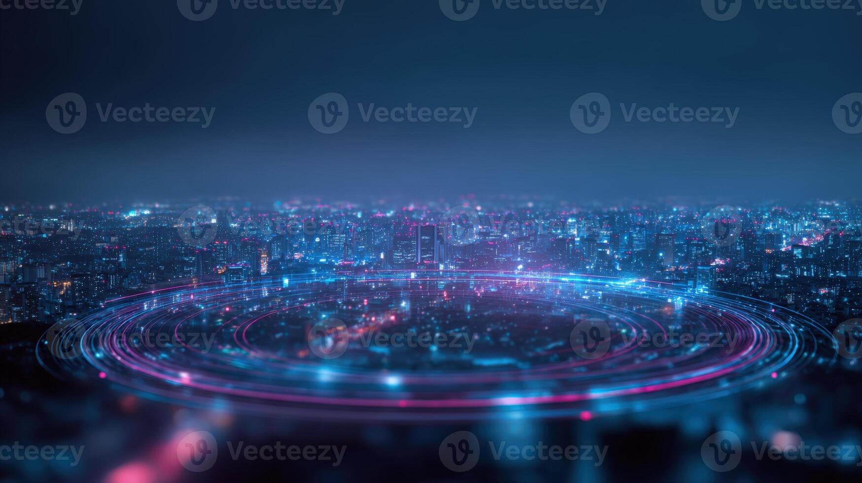 Futuristic Cityscape with Circular Data Streams and Neon Lights, Abstract Technology Visualization Pro Photo