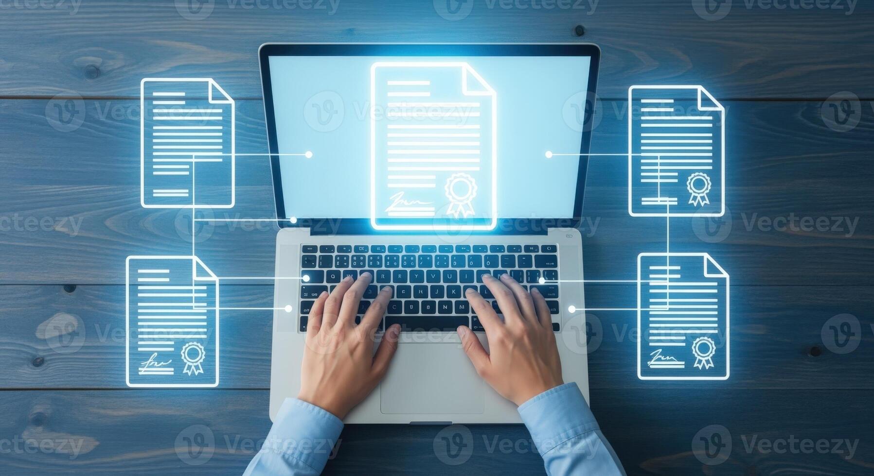 Digital Document Management Laptop with Holographic Files for Efficient Workflow and Secure Data Pro Photo