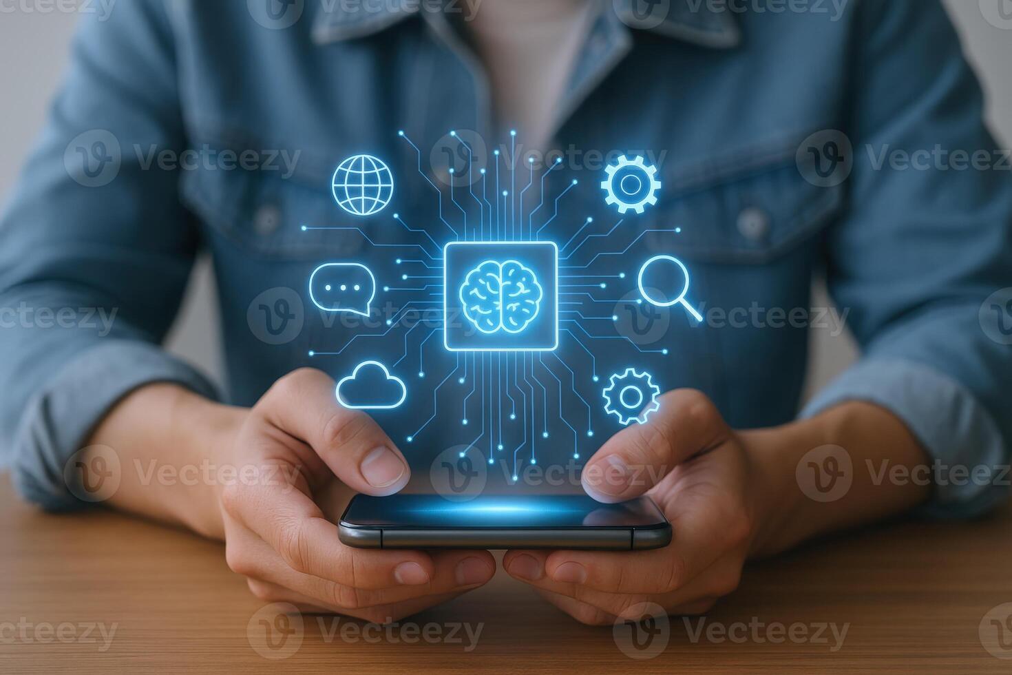 AI Brain Interface Person Using Smartphone with Artificial Intelligence Graphic Display for Modern Technology Pro Photo