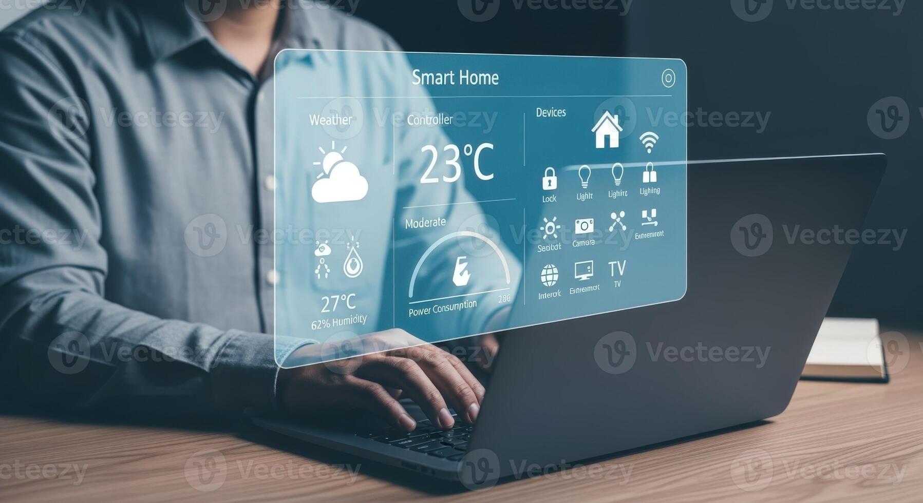 Smart Home Automation System Interface on Laptop Screen Displaying Control Panel for Connected Devices Pro Photo