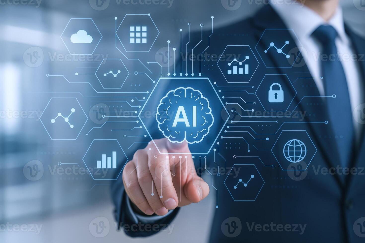 Artificial Intelligence Concept Businessman Interacting with a Digital AI Brain Interface Representing Modern Technology Pro Photo