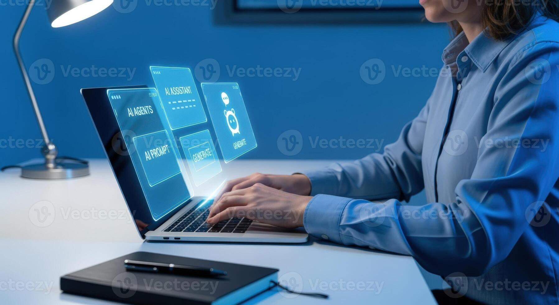 Businesswoman Working on Laptop with Augmented Reality Interface for Data Analysis and Digital Transformation Pro Photo