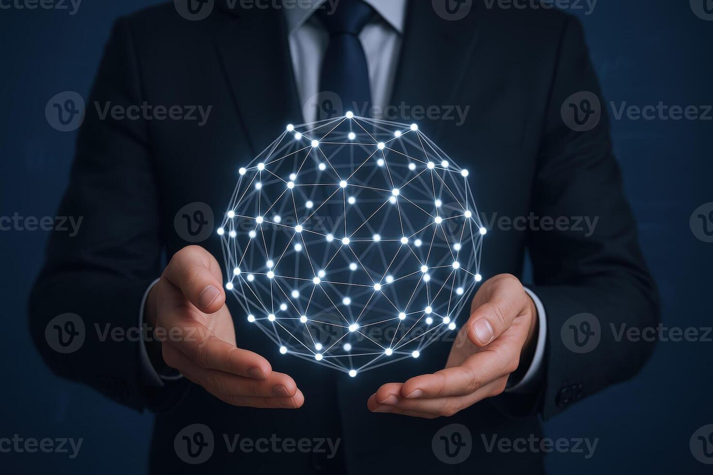 Businessman Holds Abstract Network Globe Concept of Global Connectivity, Innovation, and Futuristic Technology Pro Photo