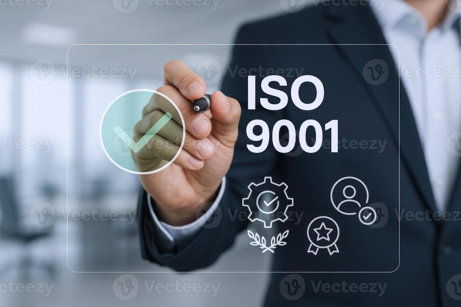 Businessman Demonstrating Quality Standards Using Stylus on Transparent Screen, Emphasizing Process Excellence and Compliance Pro Photo
