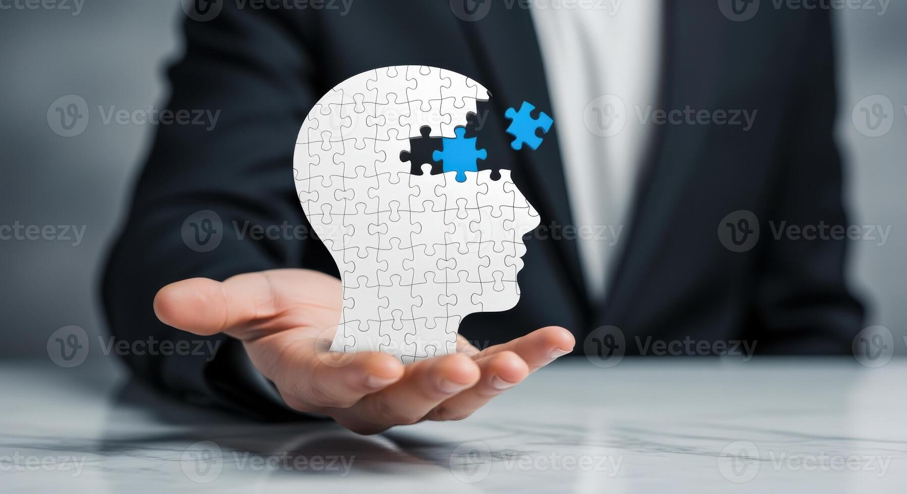 Completing the Puzzle Man Holds Head Silhouette with Missing Pieces, Representing Memory, and Mental Health Pro Photo
