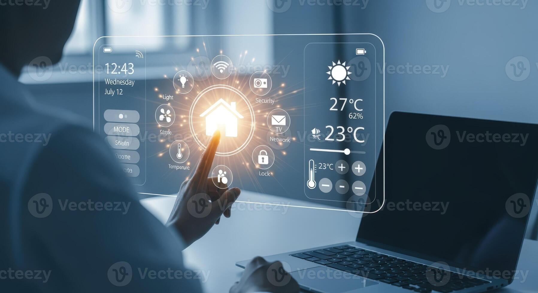 Smart Home Automation Man Interacting with Futuristic Interface to Control Home Systems via Laptop Pro Photo