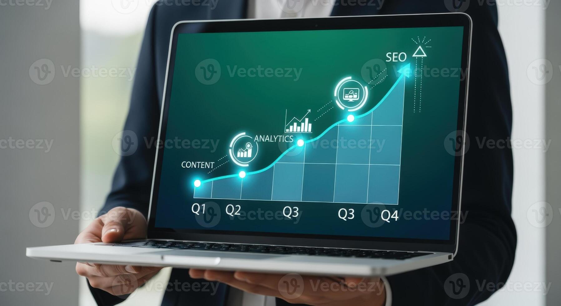 Laptop Displaying SEO Growth Chart Content, Analytics, and Optimization Strategy for Business Success Pro Photo