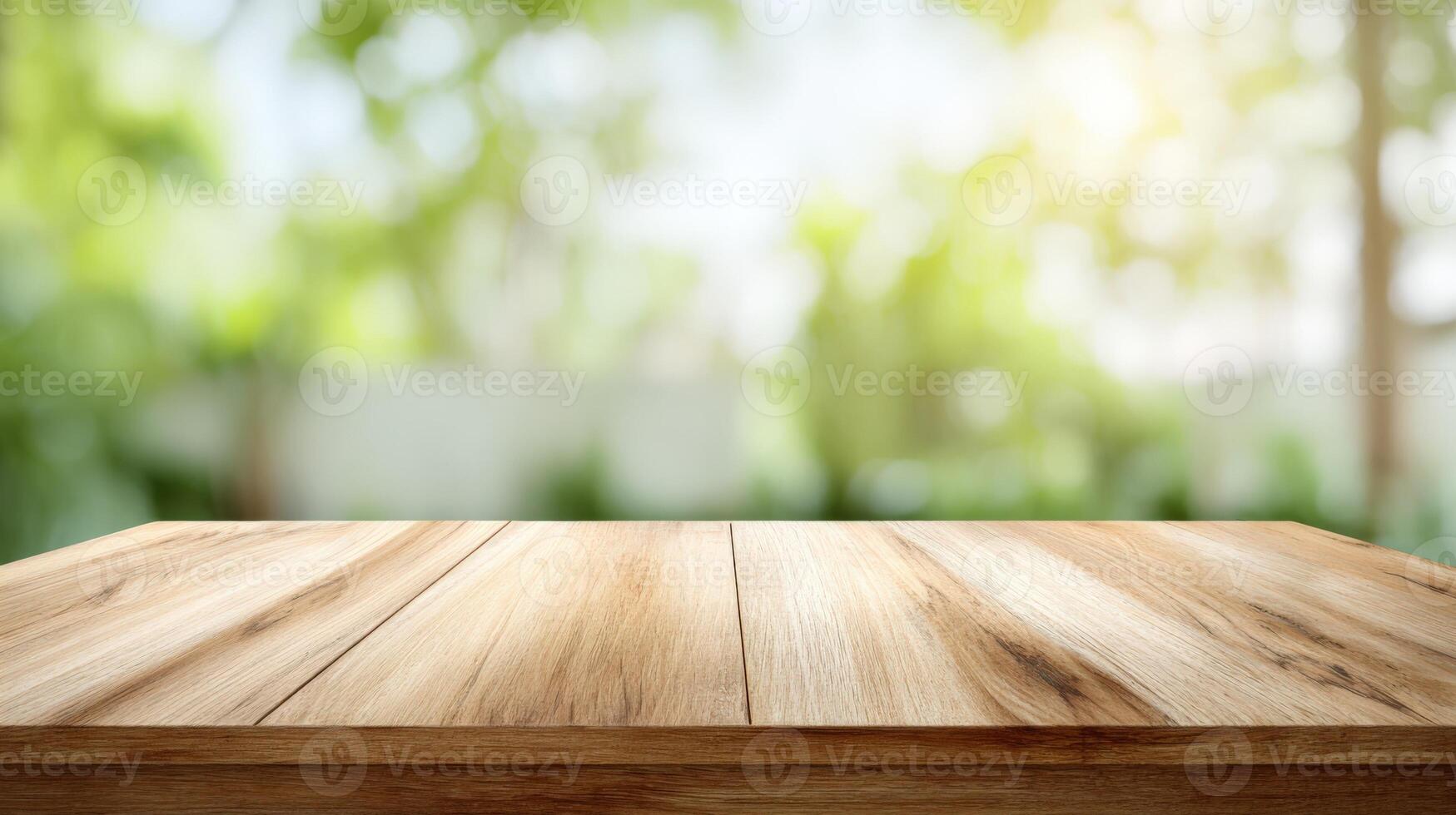 Wooden Table Surface with Natural Green Bokeh Background, Perfect for Product Display and Mockups in Spring Pro Photo