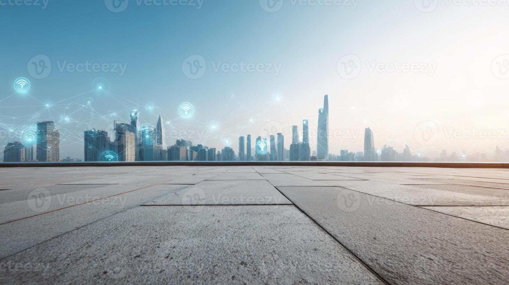 Modern Cityscape Skyline with Futuristic Technology Overlay and Empty Concrete Platform for Product Display Pro Photo