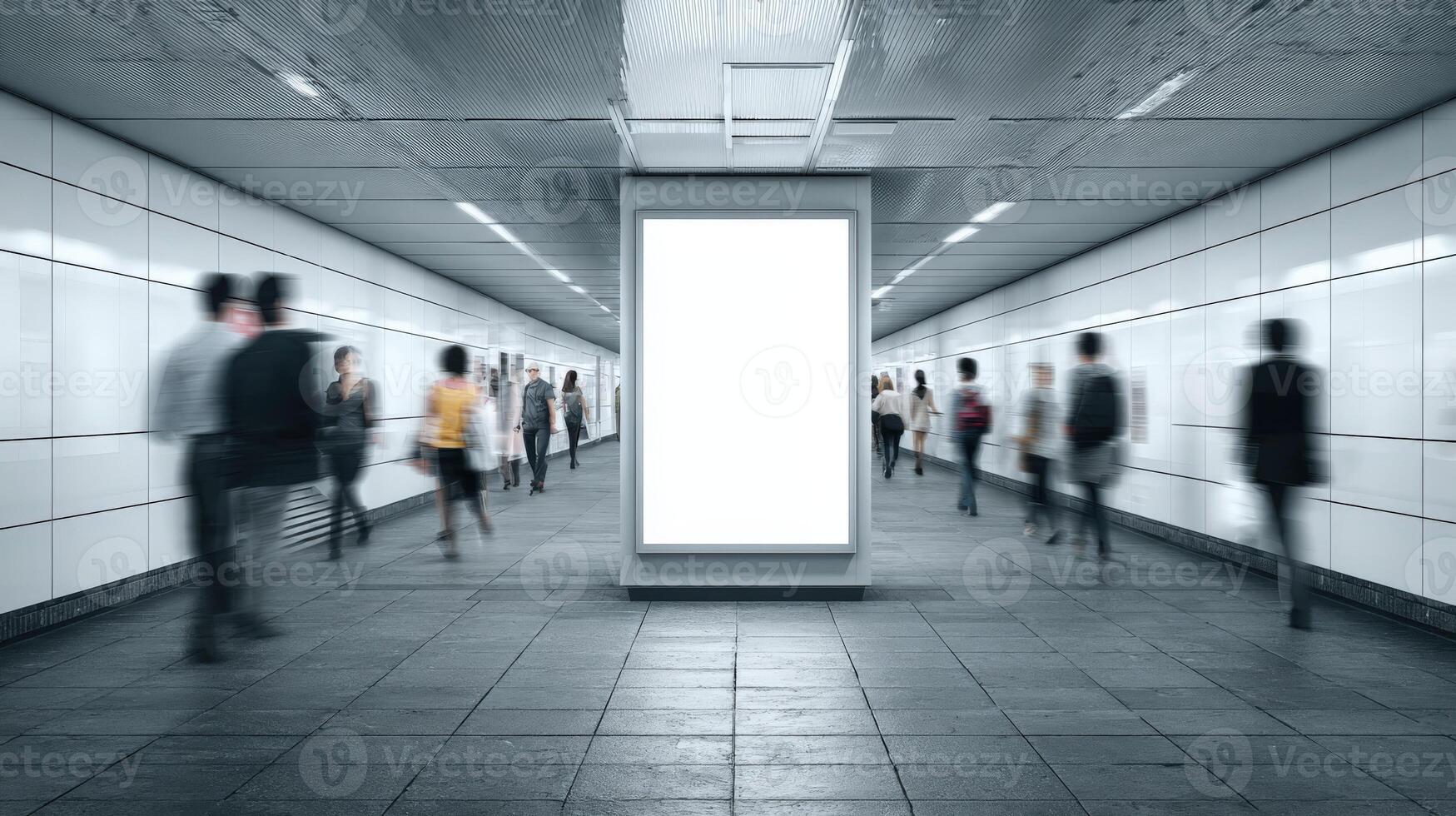 Blank Billboard Mockup in Subway Tunnel with Commuters Passing By, Advertising Template in Urban Setting Pro Photo