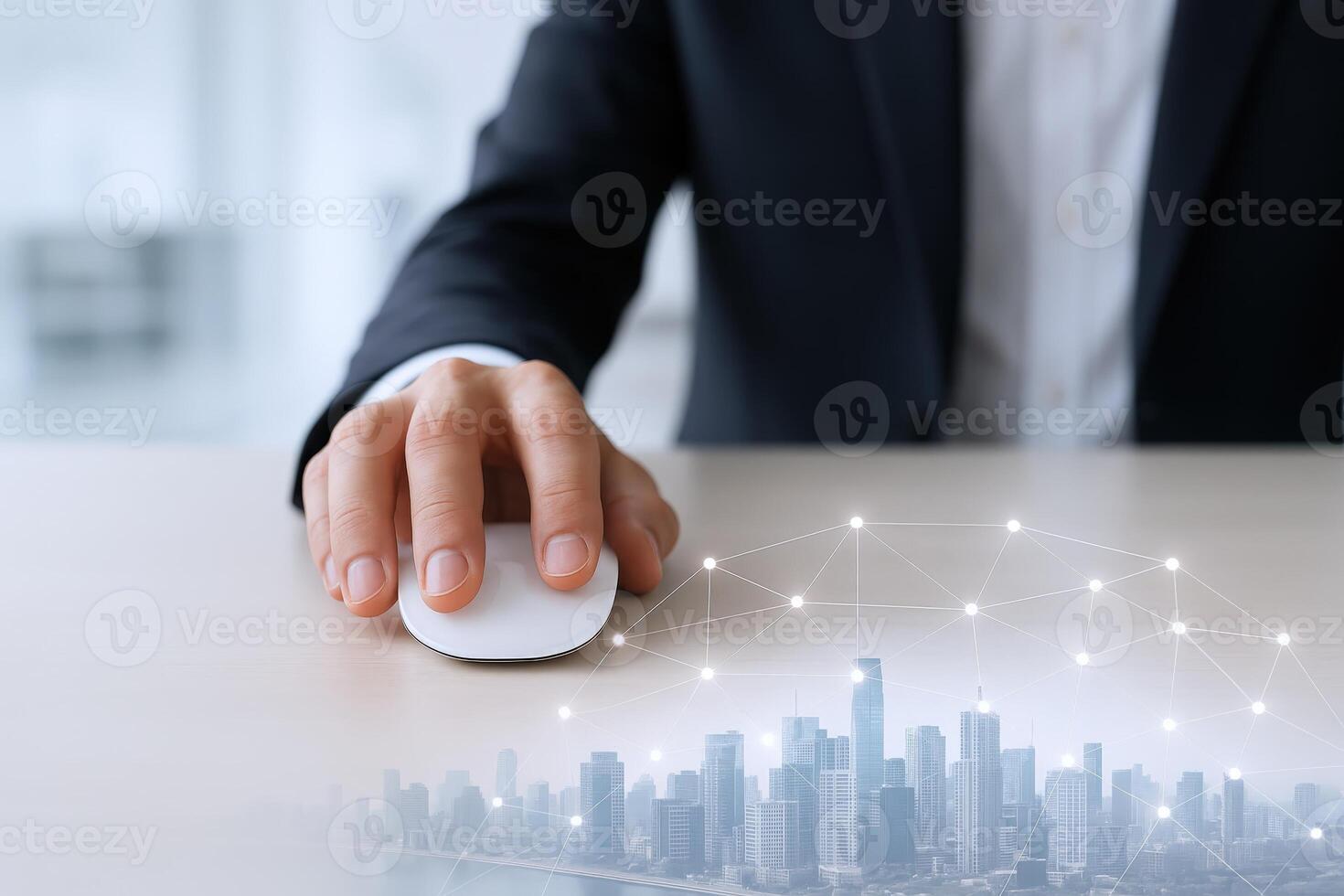 Businessman navigating digital transformation, innovation, and connectivity using a wireless mouse in the modern office Pro Photo
