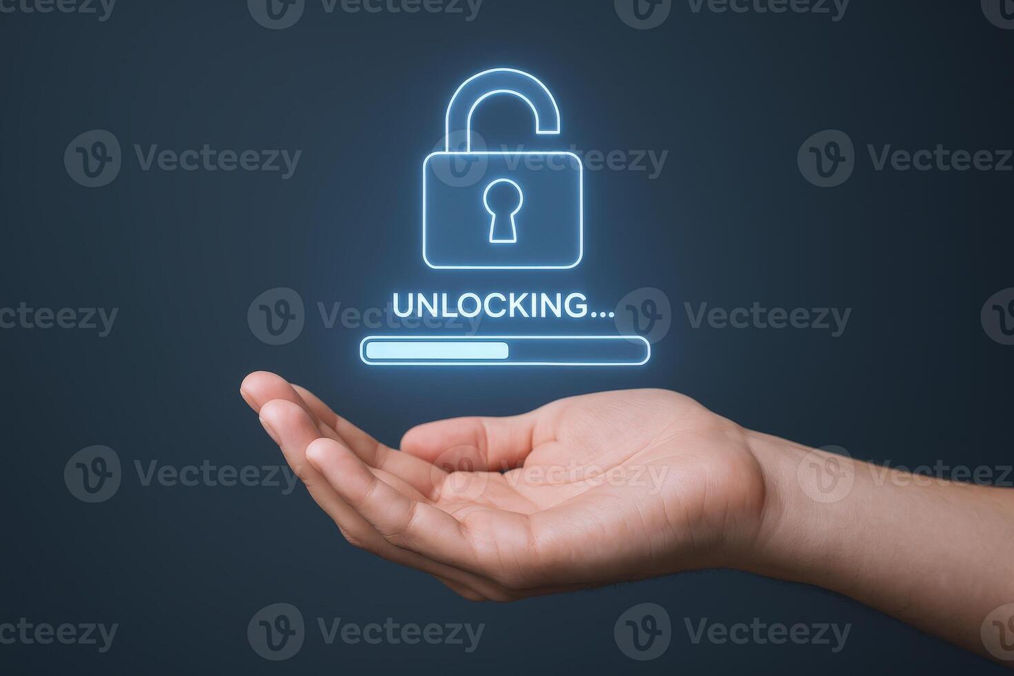 Hand Presenting Unlocking Digital Padlock Concept with Loading Bar for Security Technology and Data Protection Pro Photo