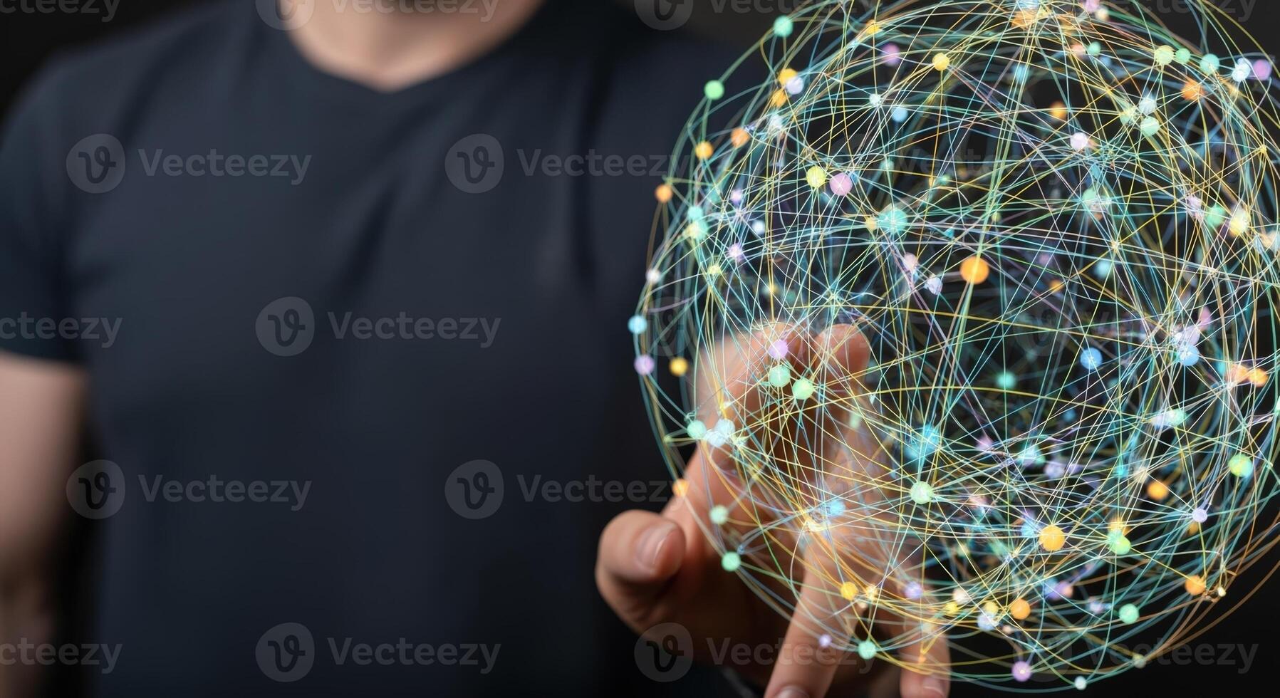 Hand Interacting with Abstract Digital Network Globe, Representing Global Communication and Technology Integration Pro Photo