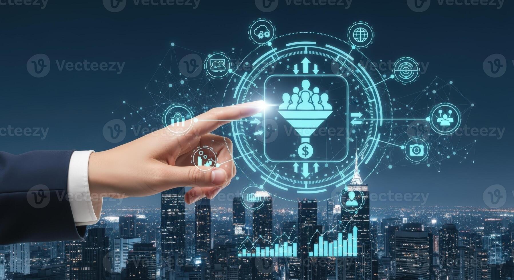Digital Marketing Conversion Funnel Visualization with Hand Pointing, Representing Business Growth and Customer Acquisition Pro Photo