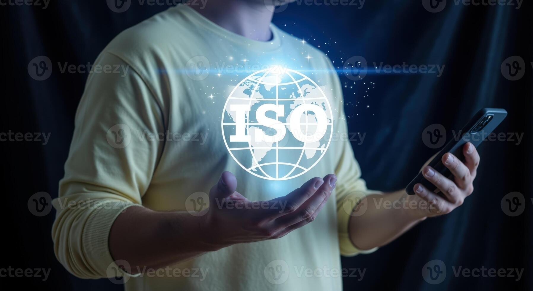 Global Standards and Technology Man Holding Mobile with ISO Digital Display for Compliance Pro Photo