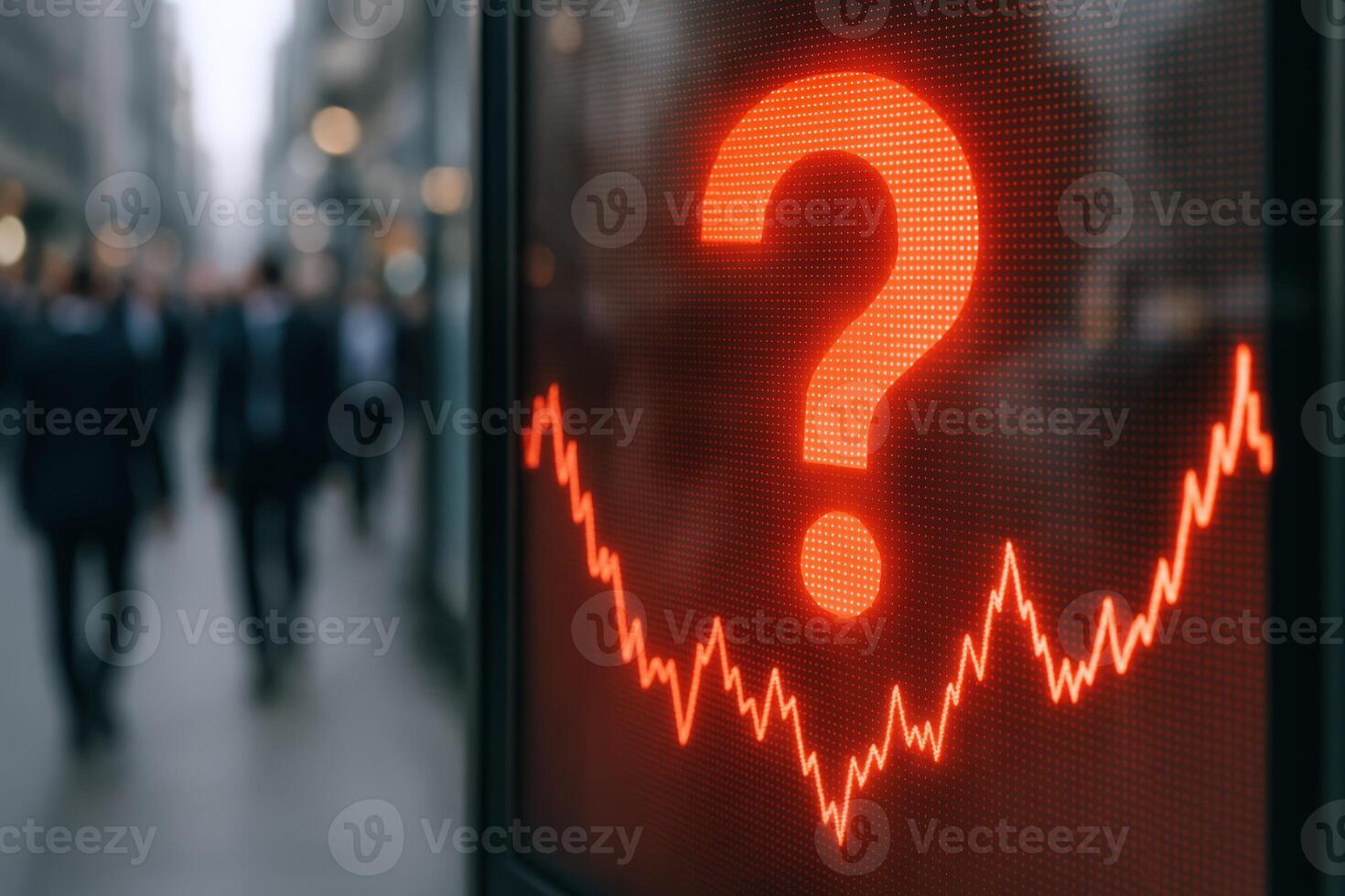 Uncertain Financial Future Red Question Mark Displayed Over Fluctuating Stock Market Graph in Urban Setting Pro Photo