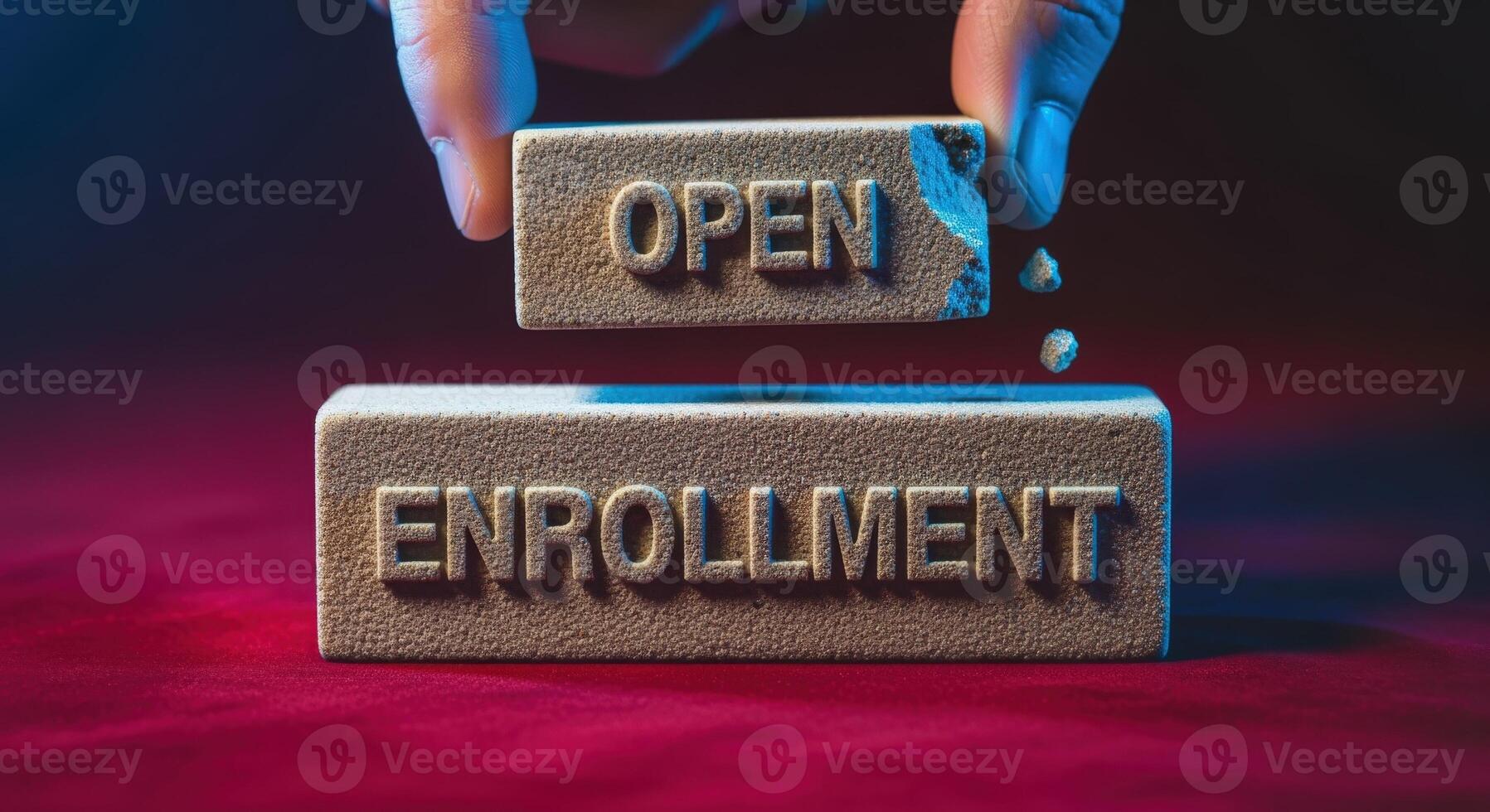 Open Enrollment Concept Hand Placing Open Block on Enrollment Block, Symbolic of Opportunity and New Beginnings Pro Photo