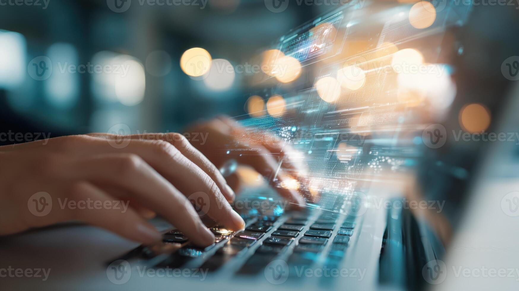 Hands Typing on Laptop with Abstract Data Stream Overlay - Technology and Connectivity Pro Photo