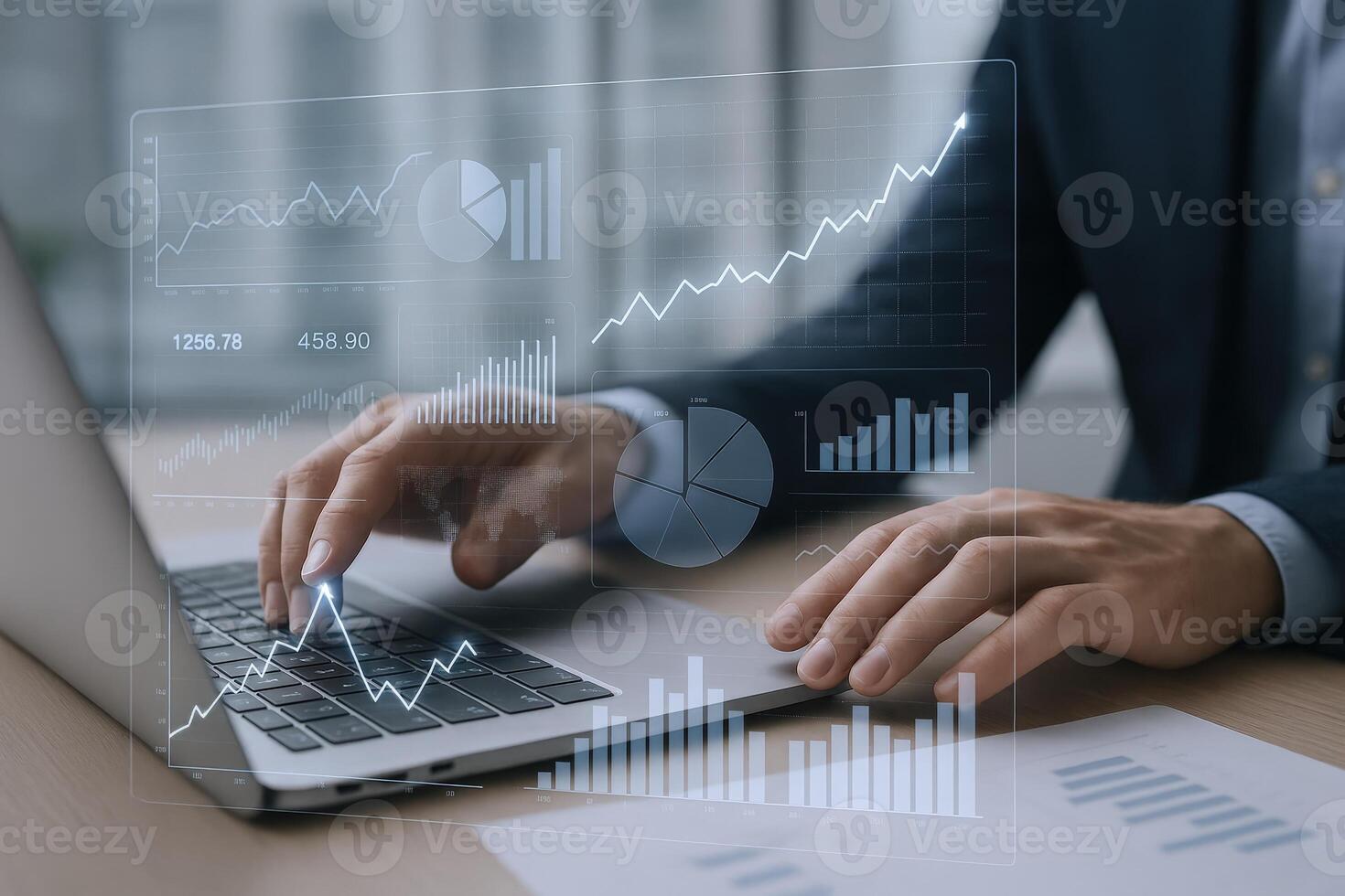 Business Analytics Financial Growth Charts Displayed Over a Professional Using Laptop for Data Analysis Pro Photo