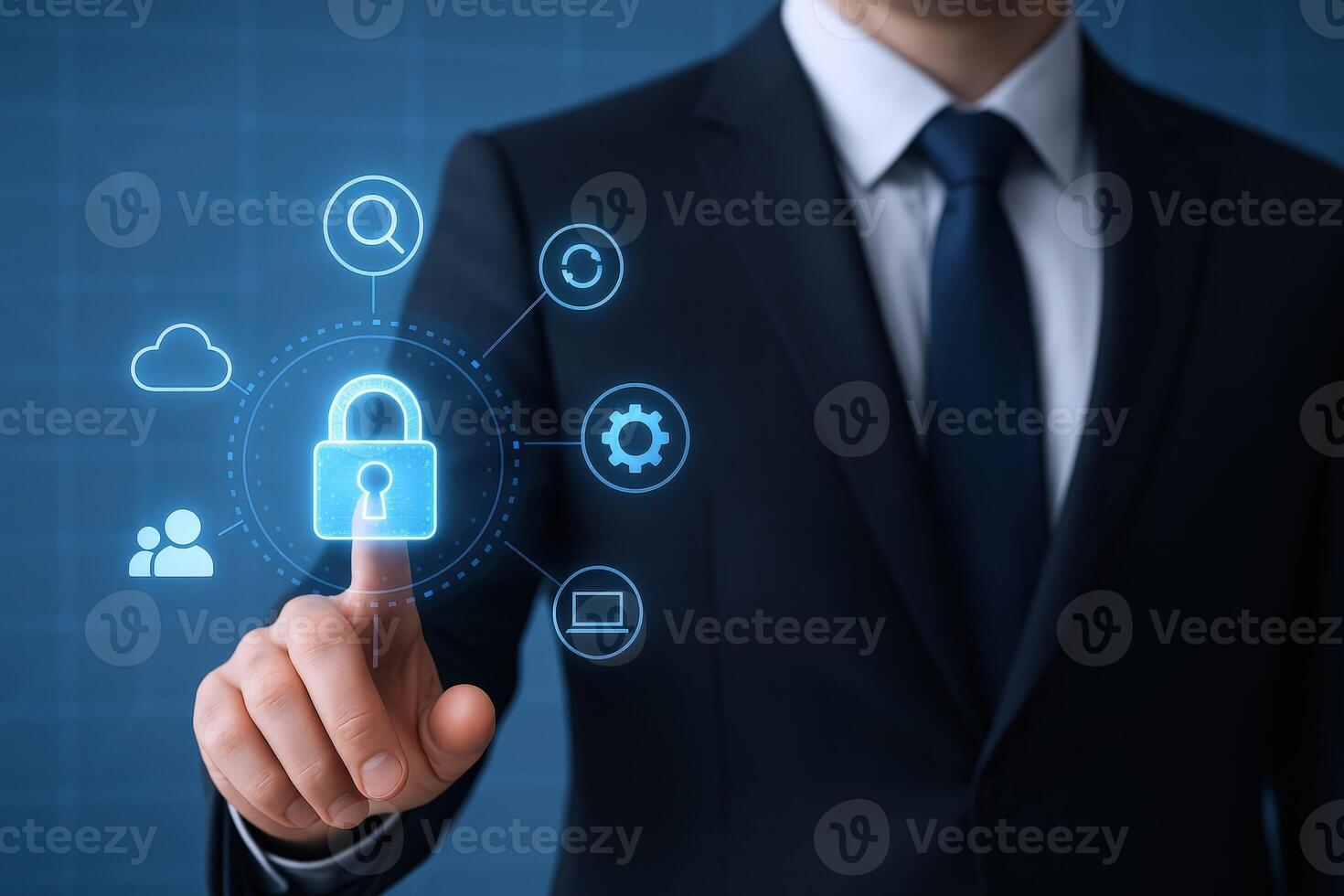 Businessman Securing Data with Fingerprint on Digital Padlock Icon, Cybersecurity and Data Privacy Protection Pro Photo