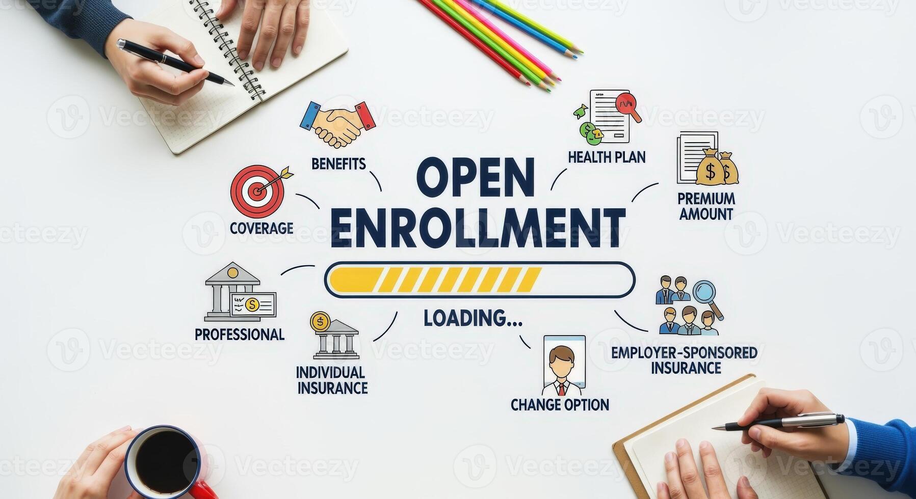 Open Enrollment Concept with Loading Bar, Benefits, Coverage, and Various Insurance Options on White Desk Pro Photo