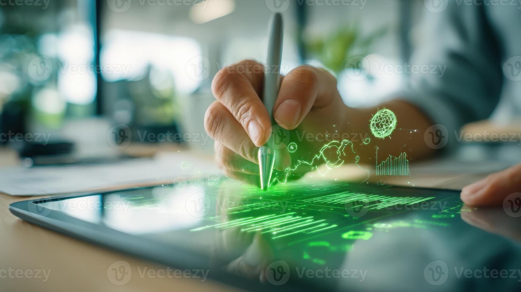 Digital Transformation A person analyzing green data and graphics on a tablet with a stylus pen Pro Photo