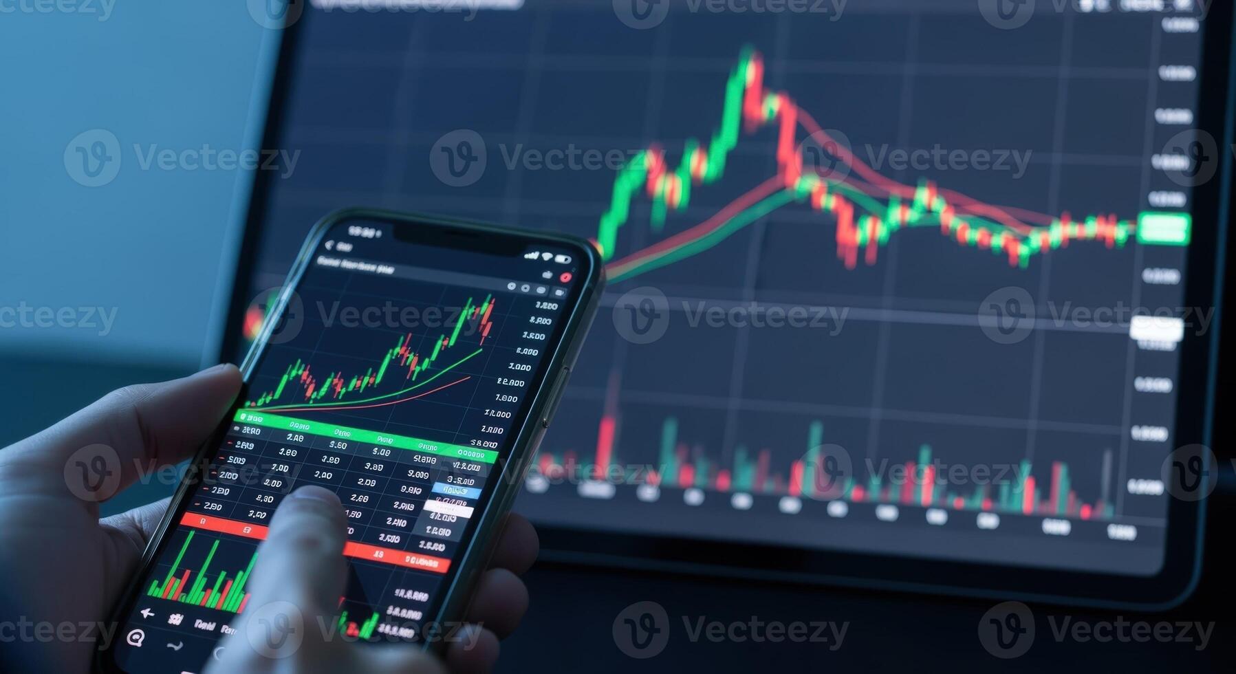 Analyzing Stock Market Data Person Using Mobile Device with Trading Chart on Laptop Screen Pro Photo