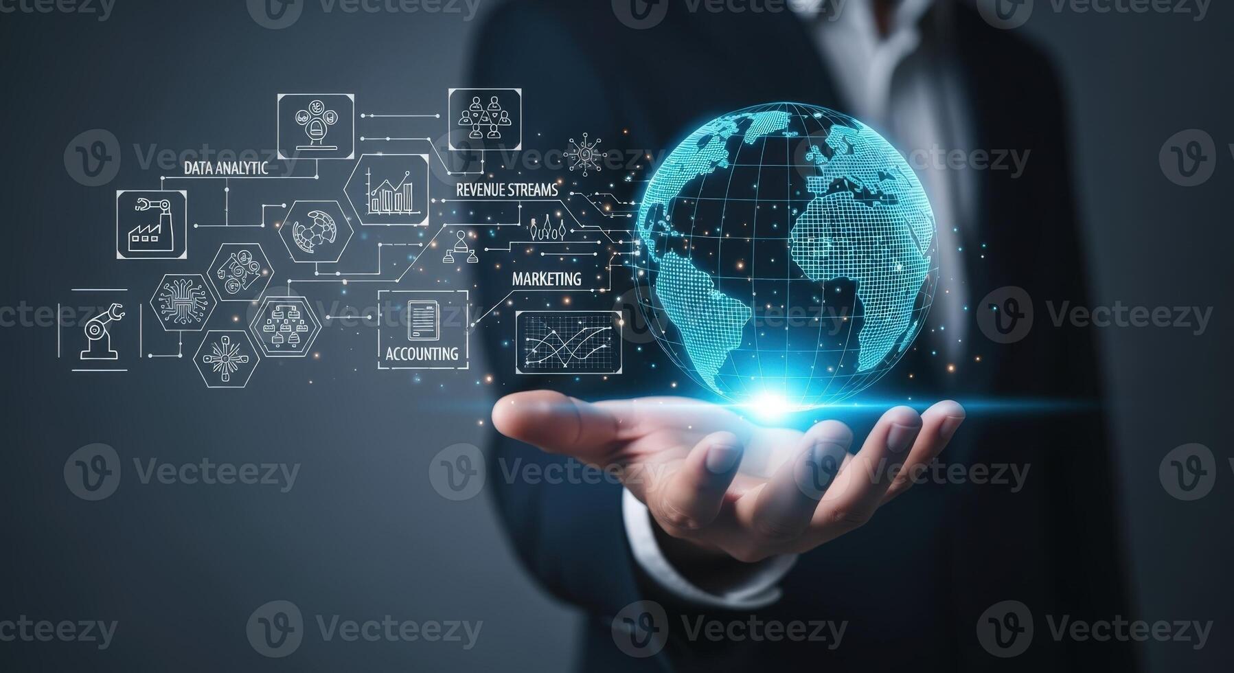 Global Business Network Man Holding Digital Globe with Data Flow Visualization for International Strategy Pro Photo
