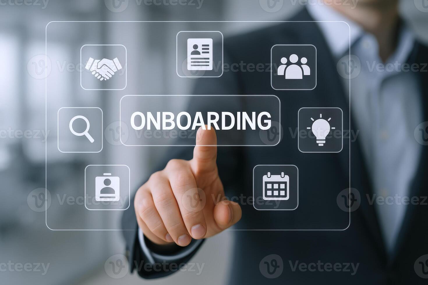 Onboarding Process Man Interacting with Digital Touchscreen Interface Representing Employee Integration and Business Collaboration Pro Photo