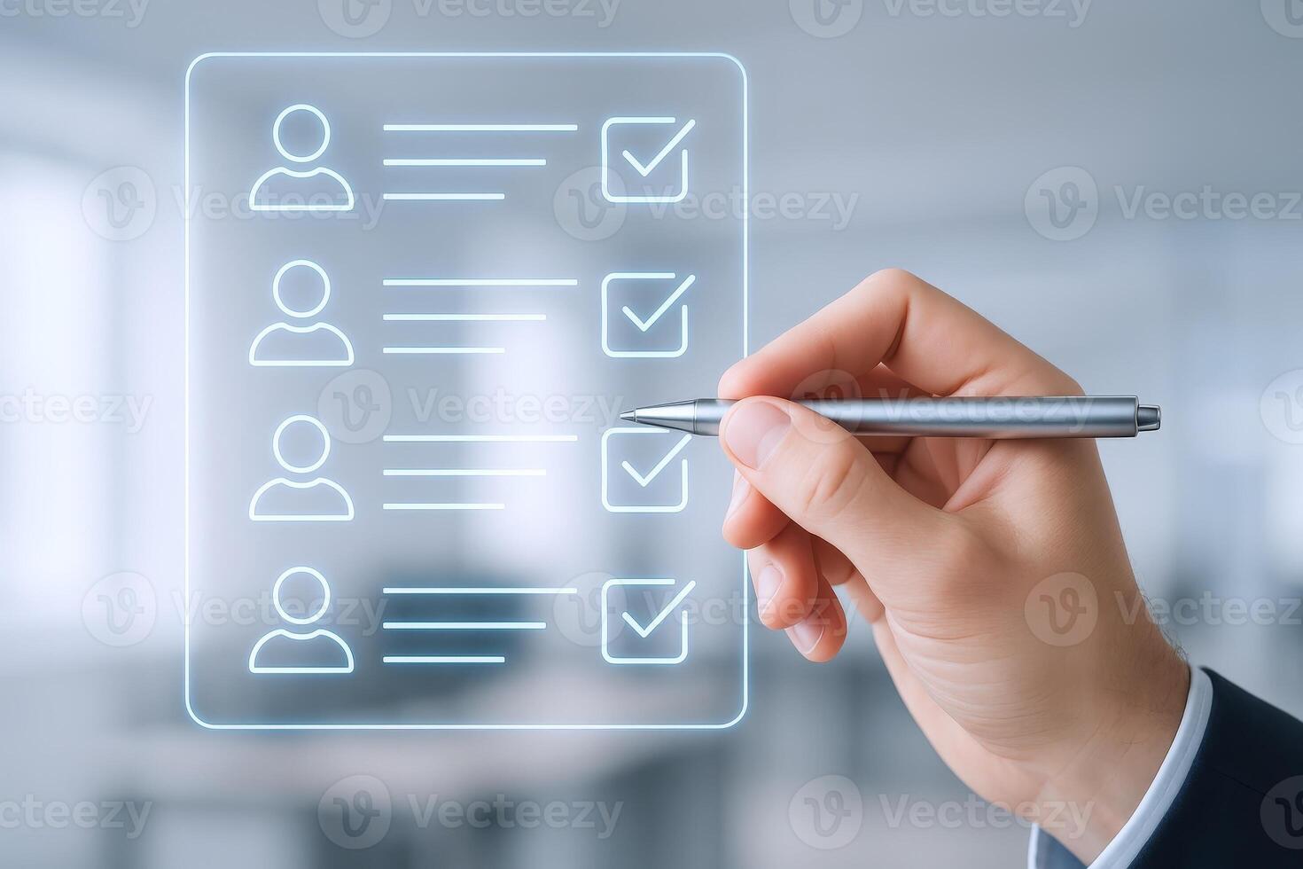 Hand with Pen Checking Boxes on Digital Checklist, Abstract Business Concept Pro Photo