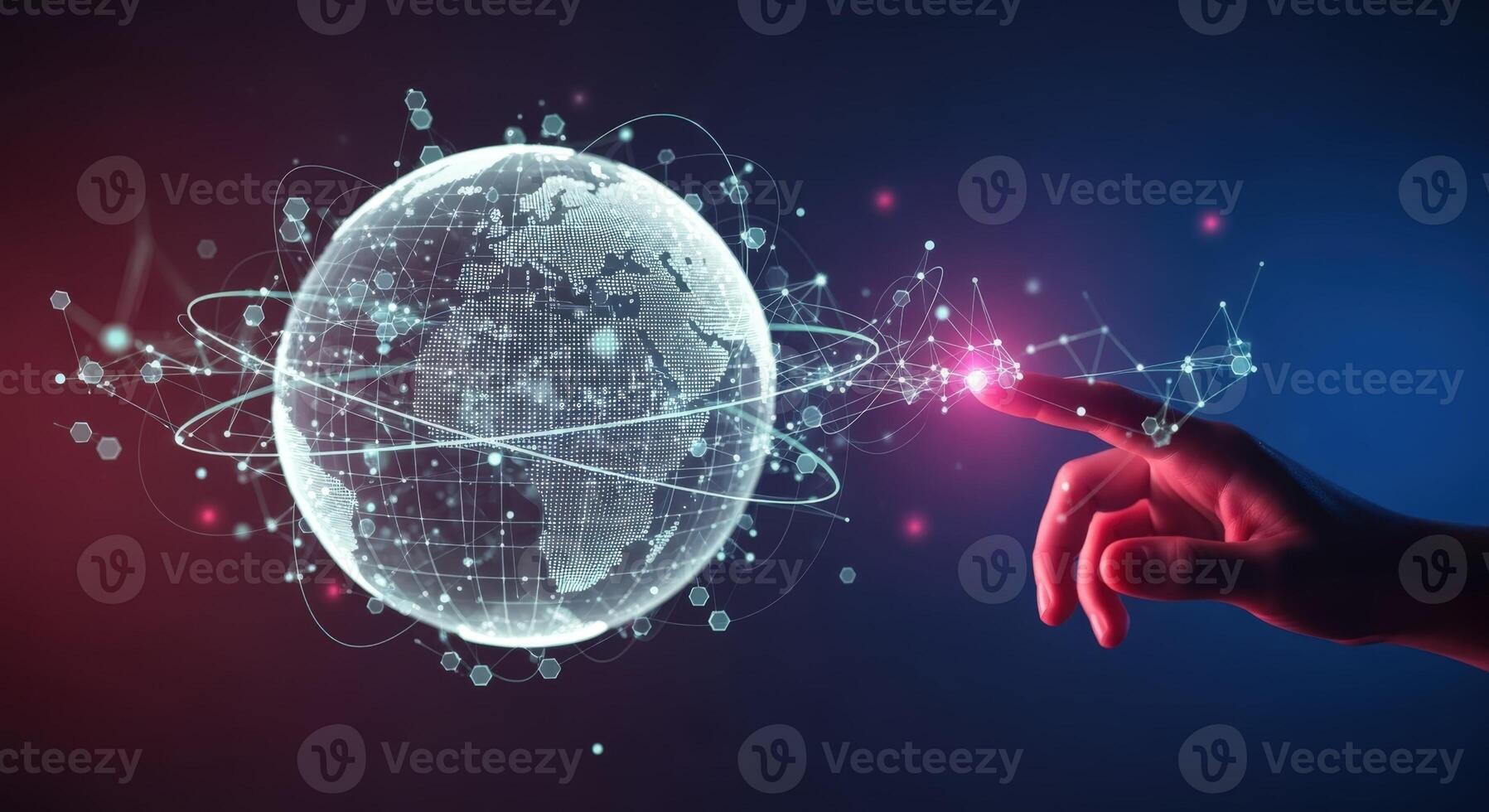 Global network communication and future technology concept, with human hand touching global data connection Pro Photo