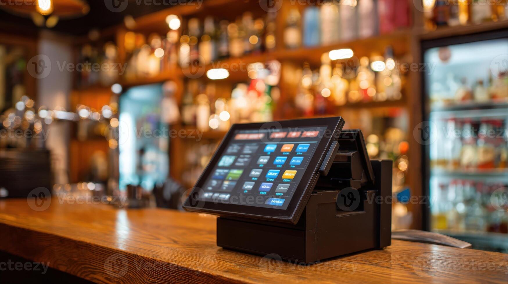 Point of Sale System on a Wooden Bar Counter in a Restaurant, streamlining transactions with a modern interface Pro Photo