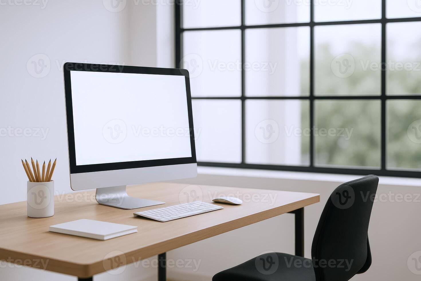 Minimalist Workspace Featuring a Computer with Blank Screen on Wooden Desk by a Window Pro Photo