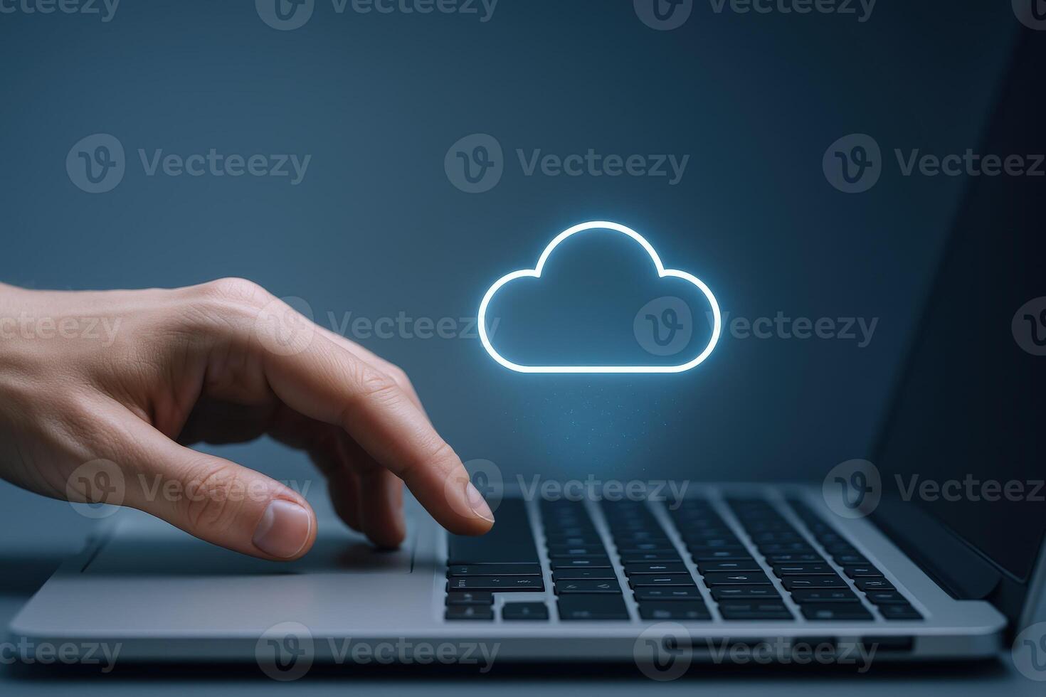 Cloud Computing Hand Interacting with Laptop Displaying Cloud Icon for Data Storage and Connectivity Pro Photo