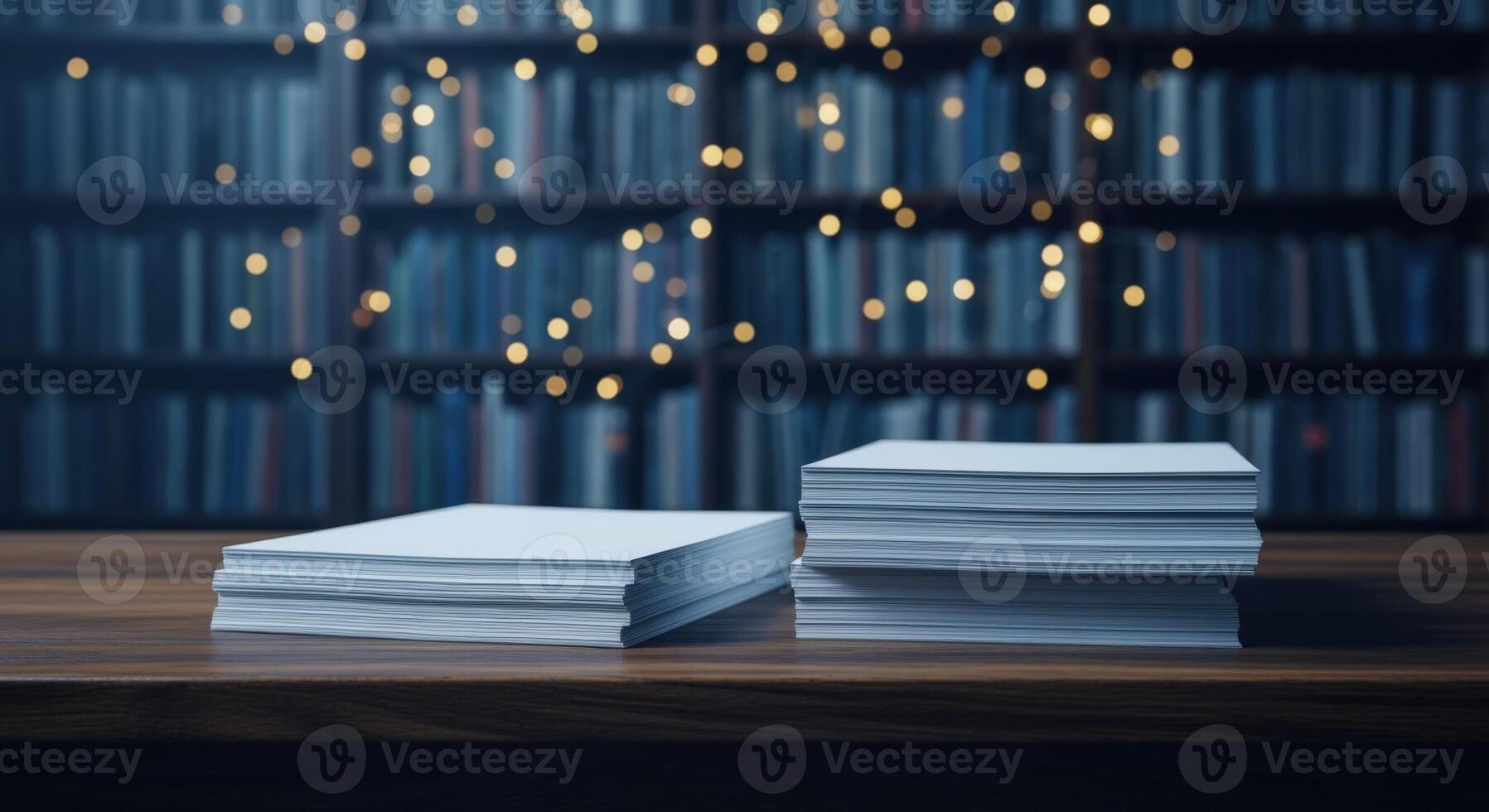 Stacks of Paper on Desk in Library Setting with Bokeh Lights Background, Elegant Workspace Pro Photo