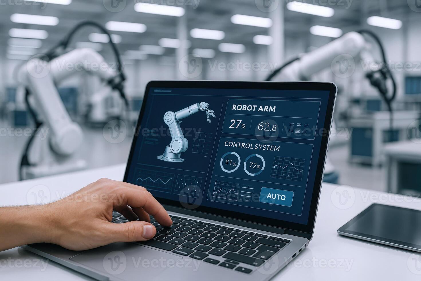 Automated Manufacturing Control System Monitoring Robot Arm Performance with Advanced Technology Interface for Efficient Production Pro Photo