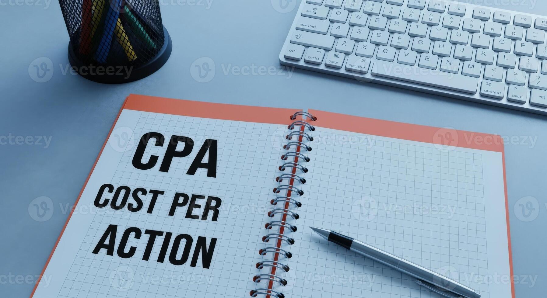 Cost Per Action Business Concept Displayed on a Notebook with Keyboard and Pen, Illustrating Digital Marketing Pro Photo